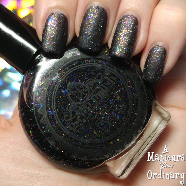 I used 2 coats plus 1 coat of Liquid Glass. This jelly was also so easy to work with. It didn’t have the depth that Carrie did to me. I think because it wasn’t quite as sheer, but it was still beautiful. The flakies are shown off really well when matte. It looked so different in different lighting, sometimes even looking purple instead of black.